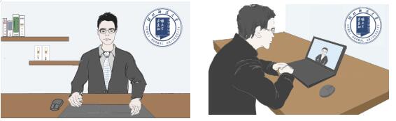 1、复试前按要求安装调试好设备。考生端两台设备开启摄像头,“一机位”电脑或手机摄像头对准考生本人(图1),“二机位”手机摄像头从考生后方成45°角拍摄(图2)。要保证考生考试屏幕能清晰地被复试专家组看到。具体效果见下图: